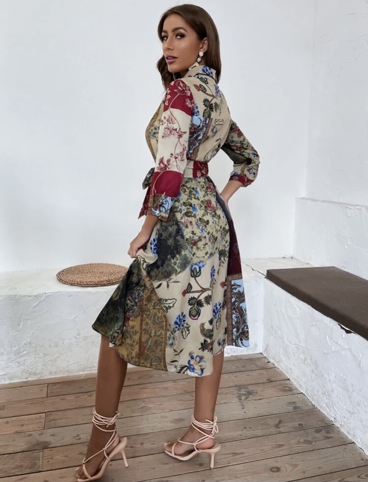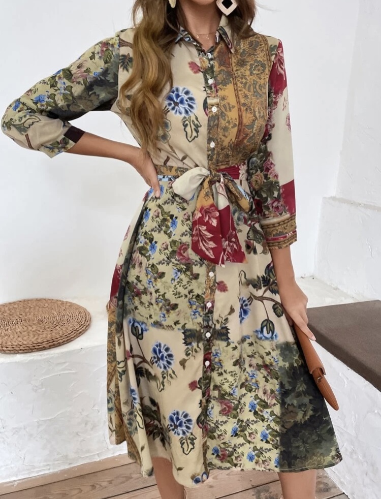 Vestido semi largo, manga semi larga, botonadura delantera, cinta para anudar en la cintura.