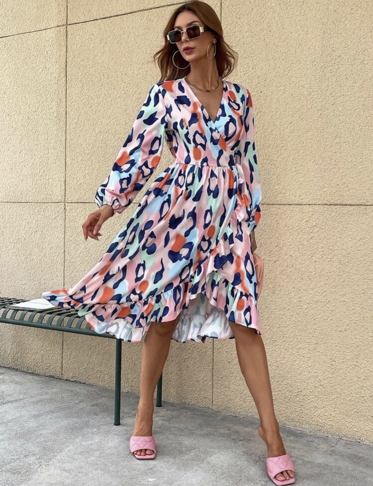 Vestido semi largo, manga larga, escote en V, volante en los bajos.