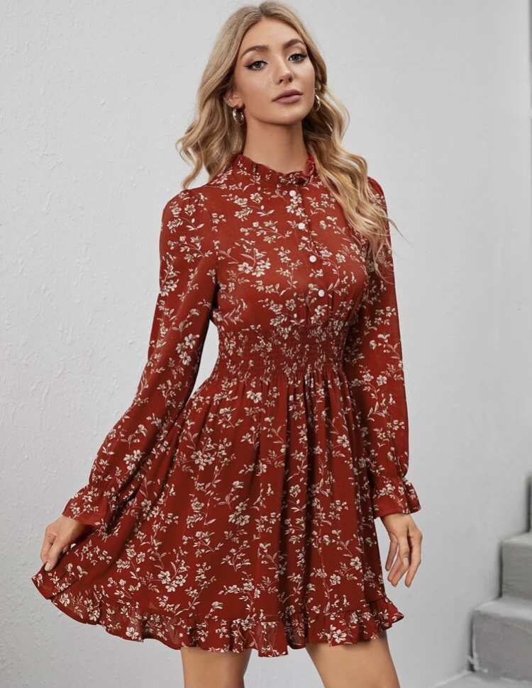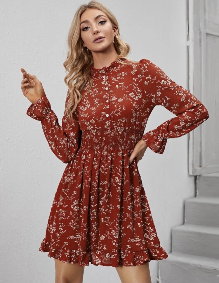 Vestido corto, de manga larga y volantes en las muñecas, cuello fruncido, botones en el pecho.