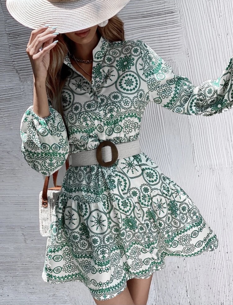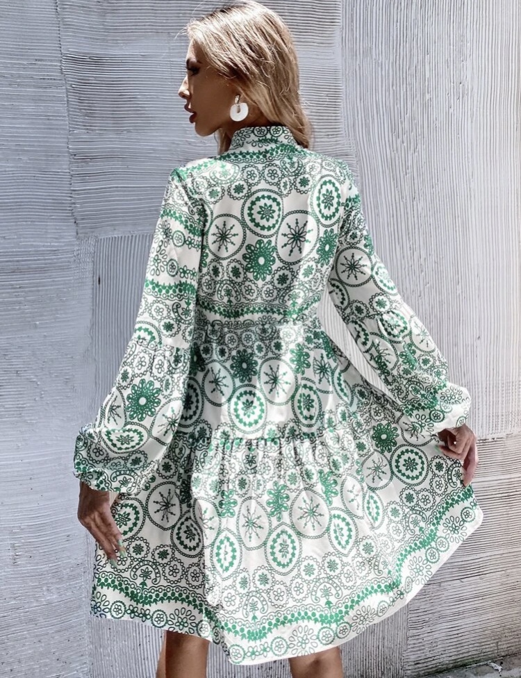 Vestido corto, de cuello mao, mangas tipo farol, botonadura en el delantero.
