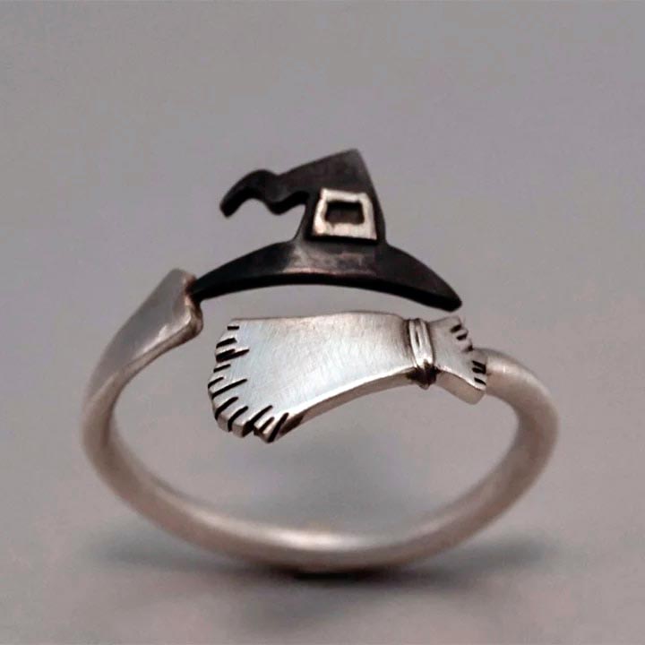 Anillo con combrero y escoba de bruja de tamaño ajustable.