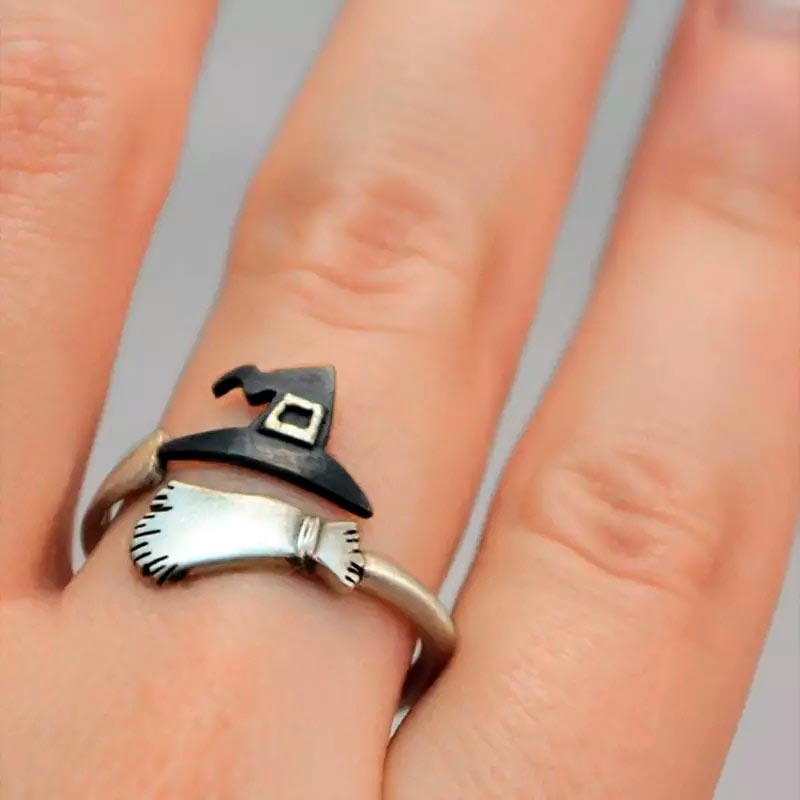 Anillo con sombrero y escoba de bruja de tamaño ajustable.