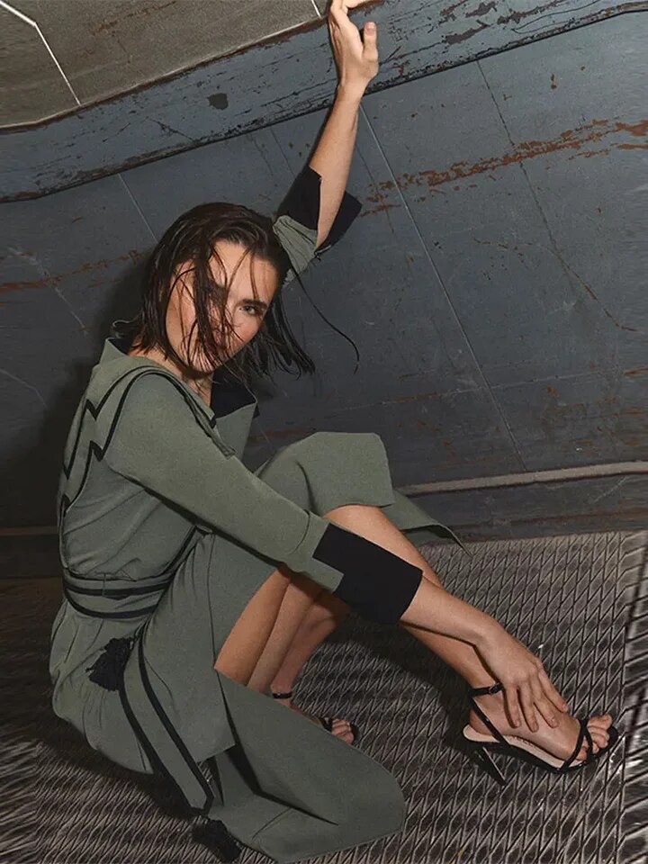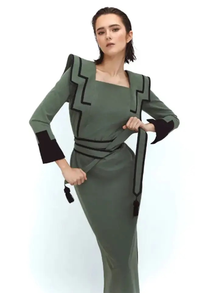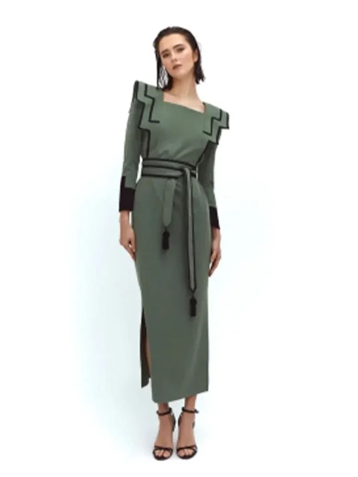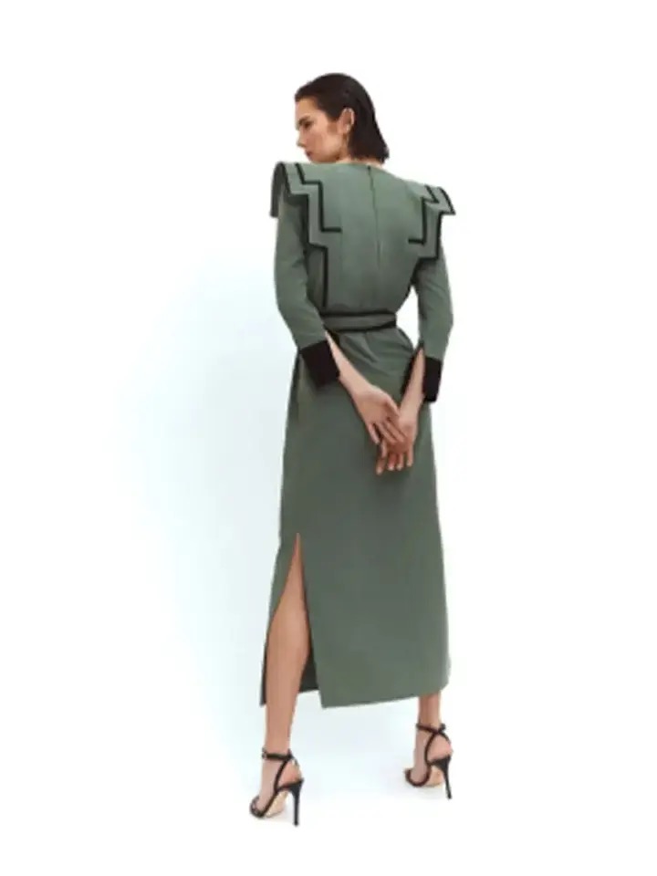 Vestido de manga larga, corte recto, apertura lateral y hombreras.
